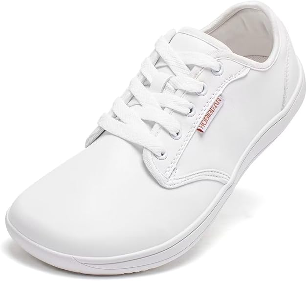 Viele weiße Modelle bestehen aus veganen Materialien oder Canvas. Dazu kommt die für Barfußschuhe wichtige breite Zehenbox, damit deine Zehen mehr Platz haben als in herkömmlichen Sneakern. Auch die Sohle ist dünn und biegsam, sodass du den Untergrund besser spürst und dein Fuß aktiver arbeiten kann.