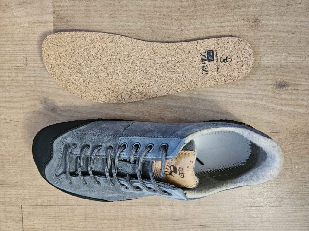 - Innensohle: Die herausnehmbare Sohle besteht aus recyceltem Kork mit einer Wollauflage. Kork ist leicht, dämpfend und isoliert hervorragend gegen Bodenkälte.
